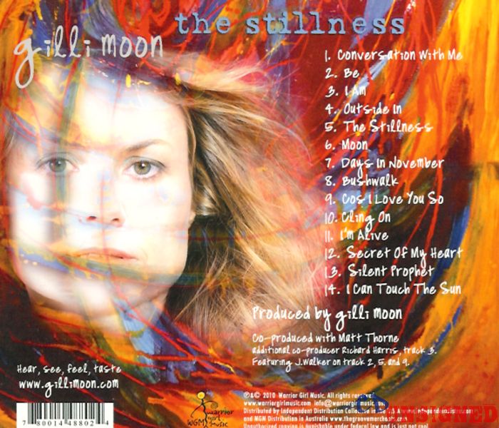 gilli moon's latest music creation, "the stillness" (her 6th album) speaks of arriving at a place of inner-ease and personal strength, of self-knowing and understanding. It talks of harmony, and peace (personal and world), of passion and prophesies, of harmony and conflict, of assurance and doubt, of love and loss... (the dual meanings of life and existence in this world that we all can't deny.)